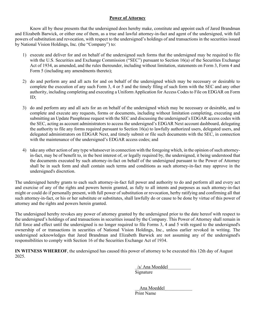 Power of Attorney Know all by these presents that the undersigned does hereby make, constitute and appoint each of Jared Brandman and Elizabeth Barwick, or either one of them, as a true and lawful attorney-in-fact and agent of the undersigned, with full powers of substitution and revocation, with respect to the undersigned’s holdings of and transactions in the securities issued by National Vision Holdings, Inc. (the “Company”) to: 1) execute and deliver for and on behalf of the undersigned such forms that the undersigned may be required to file with the U.S. Securities and Exchange Commission (“SEC”) pursuant to Section 16(a) of the Securities Exchange Act of 1934, as amended, and the rules thereunder, including without limitation, statements on Form 3, Form 4 and Form 5 (including any amendments thereto); 2) do and perform any and all acts for and on behalf of the undersigned which may be necessary or desirable to complete the execution of any such Form 3, 4 or 5 and the timely filing of such form with the SEC and any other authority, including completing and executing a Uniform Application for Access Codes to File on EDGAR on Form ID; 3) do and perform any and all acts for an on behalf of the undersigned which may be necessary or desirable, and to complete and execute any requests, forms or documents, including without limitation completing, executing and submitting an Update Passphrase request with the SEC and discussing the undersigned’s EDGAR access codes with the SEC, acting as account administrators to access the undersigned’s EDGAR Next account dashboard, delegating the authority to file any forms required pursuant to Section 16(a) to lawfully authorized users, delegated users, and delegated administrators on EDGAR Next, and timely submit or file such documents with the SEC, in connection with the maintenance of the undersigned’s EDGAR access codes; and 4) take any other action of any type whatsoever in connection with the foregoing which, in the opinion of such attorney- in-fact, may be of benefit to, in the best interest of, or legally required by, the undersigned, it being understood that the documents executed by such attorney-in-fact on behalf of the undersigned pursuant to the Power of Attorney shall be in such form and shall contain such terms and conditions as such attorney-in-fact may approve in the undersigned's discretion. The undersigned hereby grants to each such attorney-in-fact full power and authority to do and perform all and every act and exercise of any of the rights and powers herein granted, as fully to all intents and purposes as such attorney-in-fact might or could do if personally present, with full power of substitution or revocation, herby ratifying and confirming all that such attorney-in-fact, or his or her substitute or substitutes, shall lawfully do or cause to be done by virtue of this power of attorney and the rights and powers herein granted. The undersigned hereby revokes any power of attorney granted by the undersigned prior to the date hereof with respect to the undersigned’s holdings of and transactions in securities issued by the Company. This Power of Attorney shall remain in full force and effect until the undersigned is no longer required to file Forms 3, 4 and 5 with regard to the undersigned's ownership of or transactions in securities of National Vision Holdings, Inc., unless earlier revoked in writing. The undersigned acknowledges that Jared Brandman and Elizabeth Barwick are not assuming any of the undersigned's responsibilities to comply with Section 16 of the Securities Exchange Act of 1934. IN WITNESS WHEREOF, the undersigned has caused this power of attorney to be executed this 12th day of August 2025. _/s/ Ana Moeddel__________ Signature __Ana Moeddel____________ Print Name
